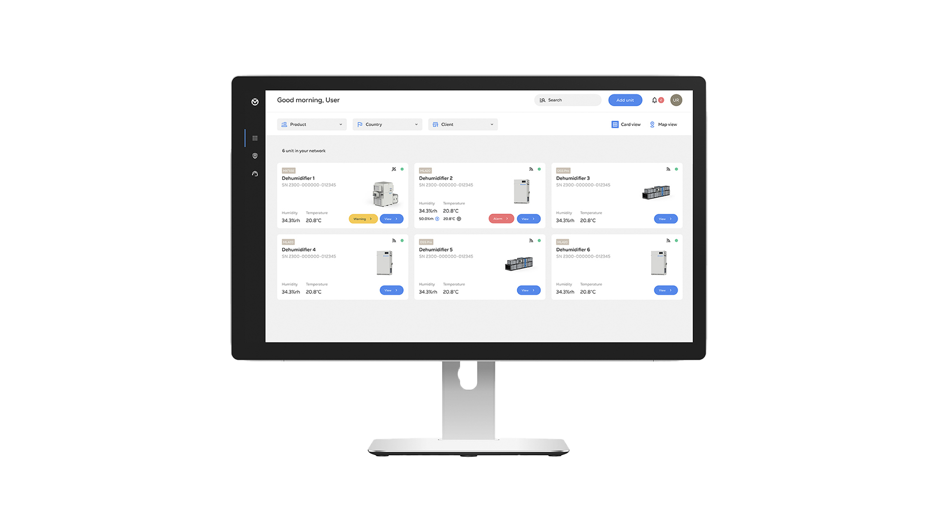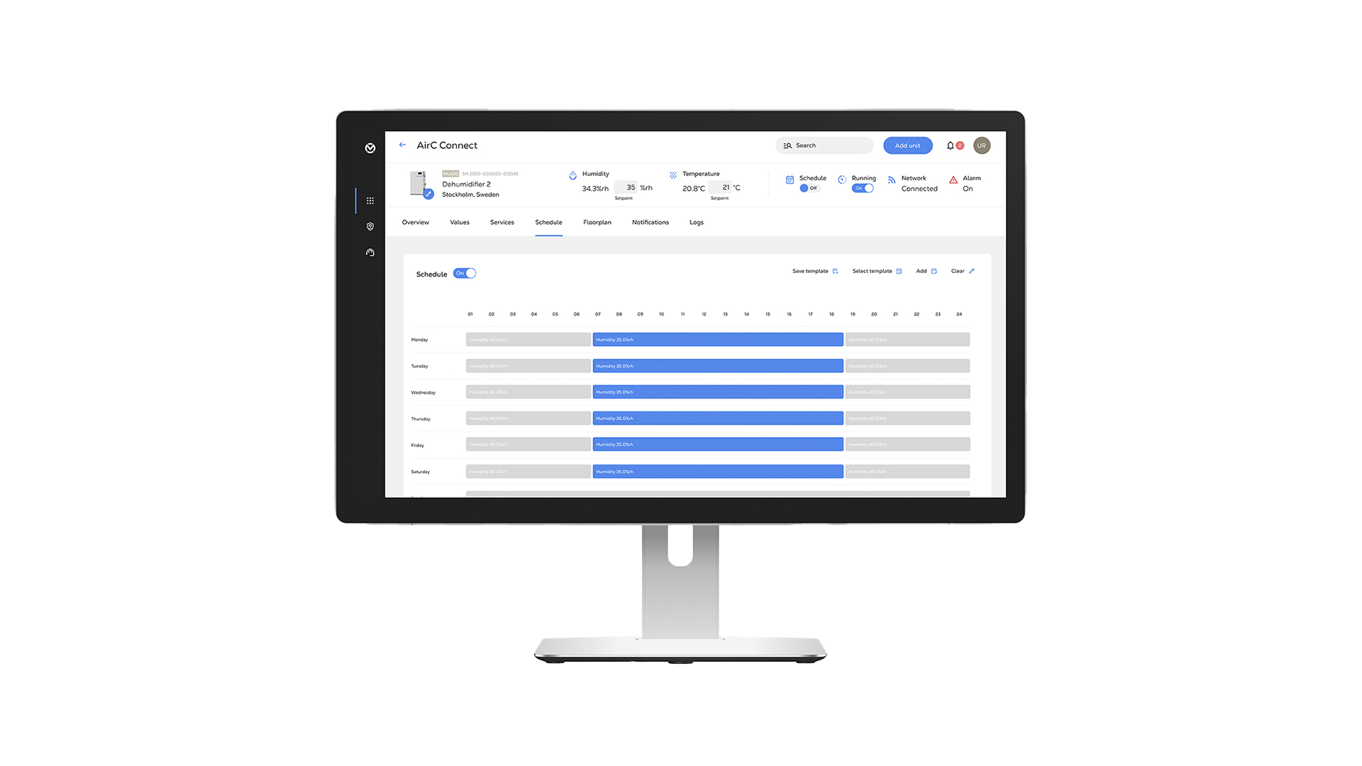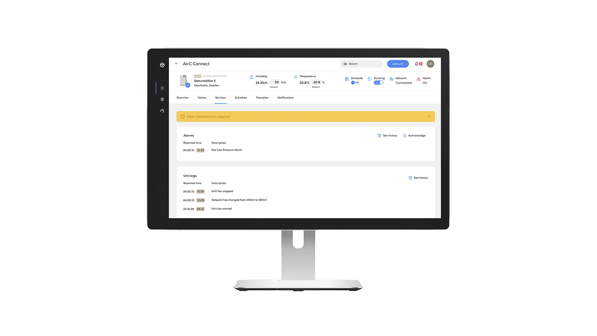 AirC Connect allows you to experience effortless remote climate management for your Munters dehumidifier. Monitor and adjust temperature and humidity settings, schedule operations, receive personalized alarms and access both live and historical data - all from your desktop or mobile device.