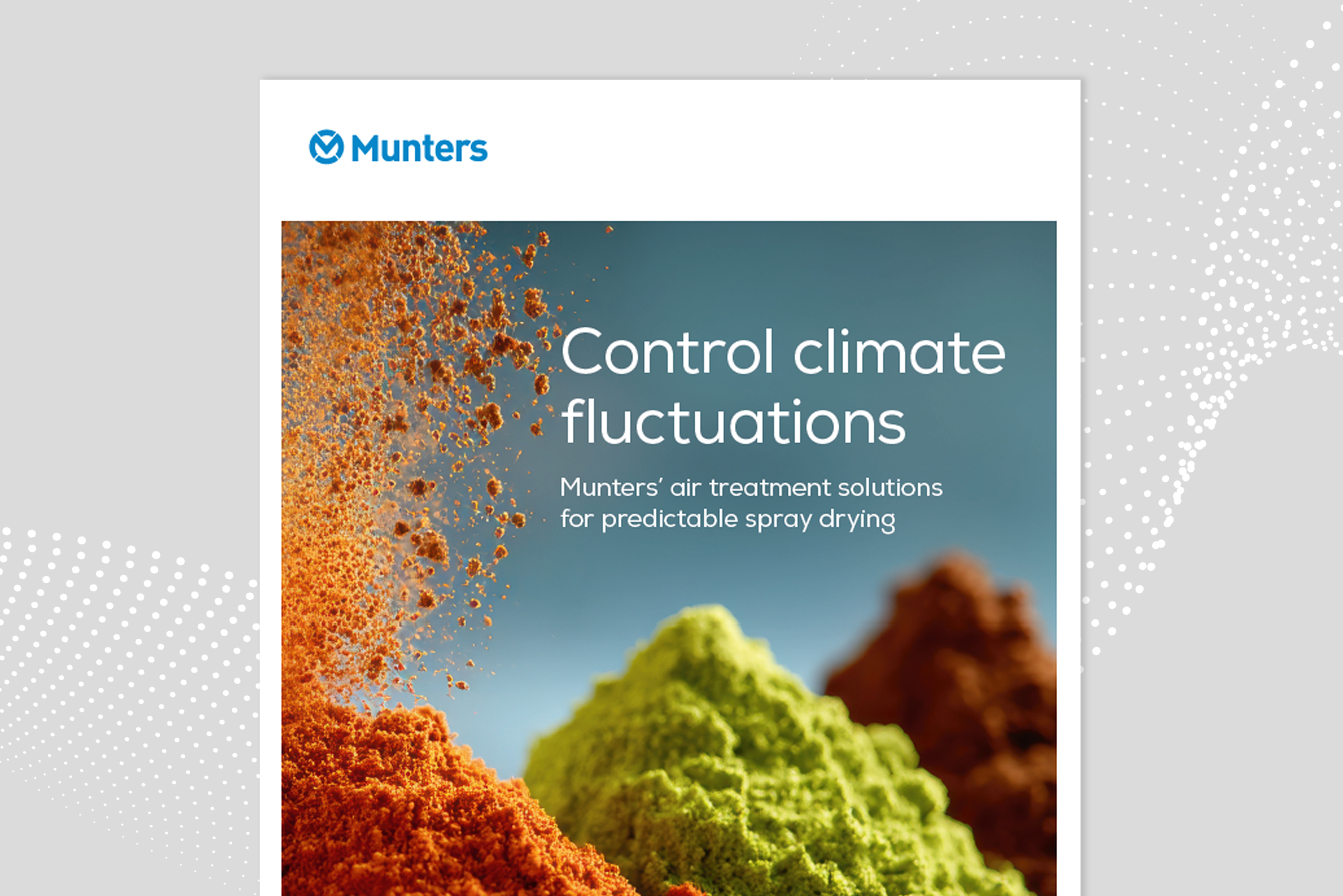 Munters' air treatment solutions create a controlled, low-humidity environment that prevents powder from lumping, clumping, or spoiling during spray drying. This ensures powders maintain the intended moisture content and particle characteristics, delivering uniform bulk density and minimal rejects.