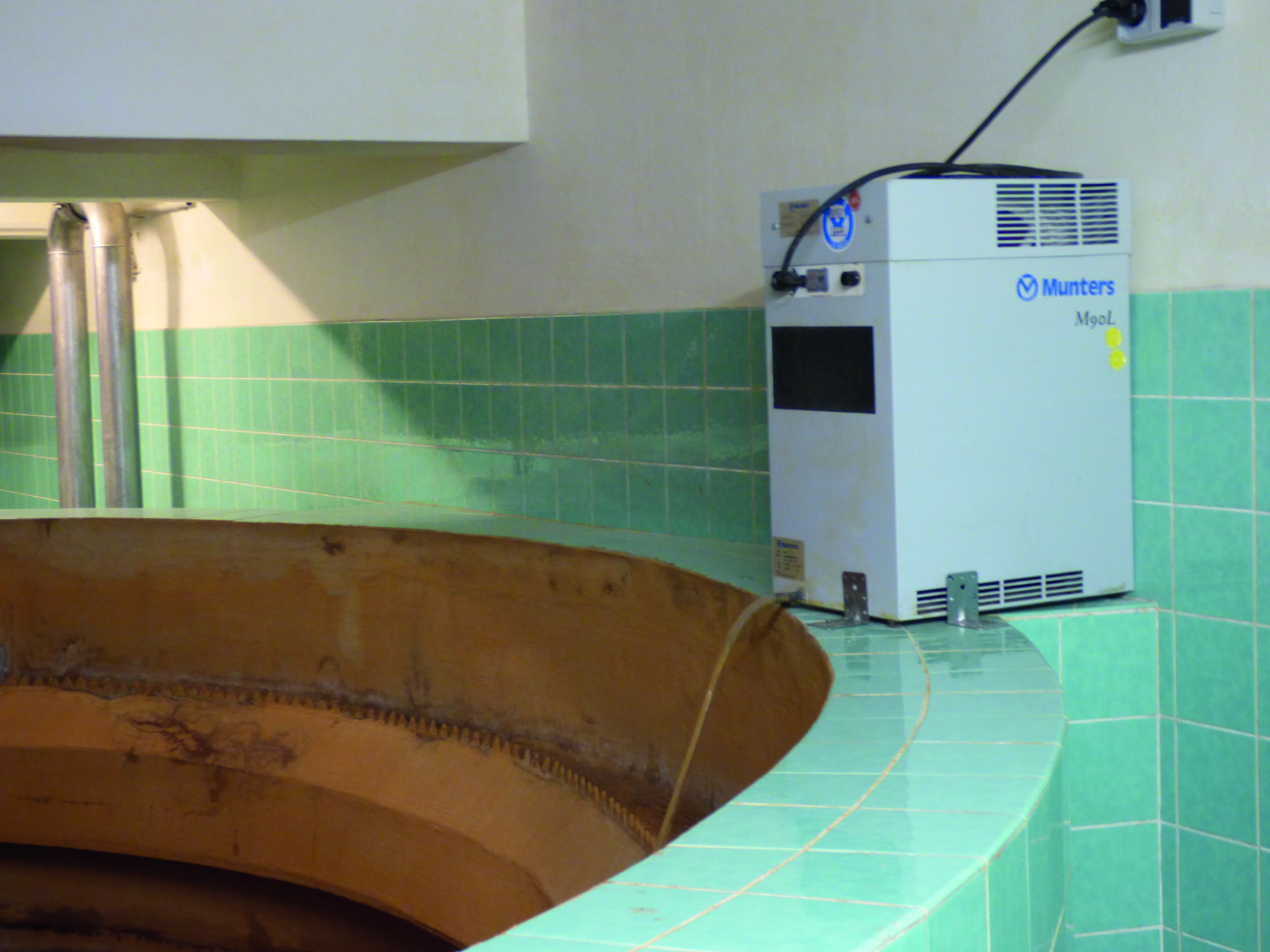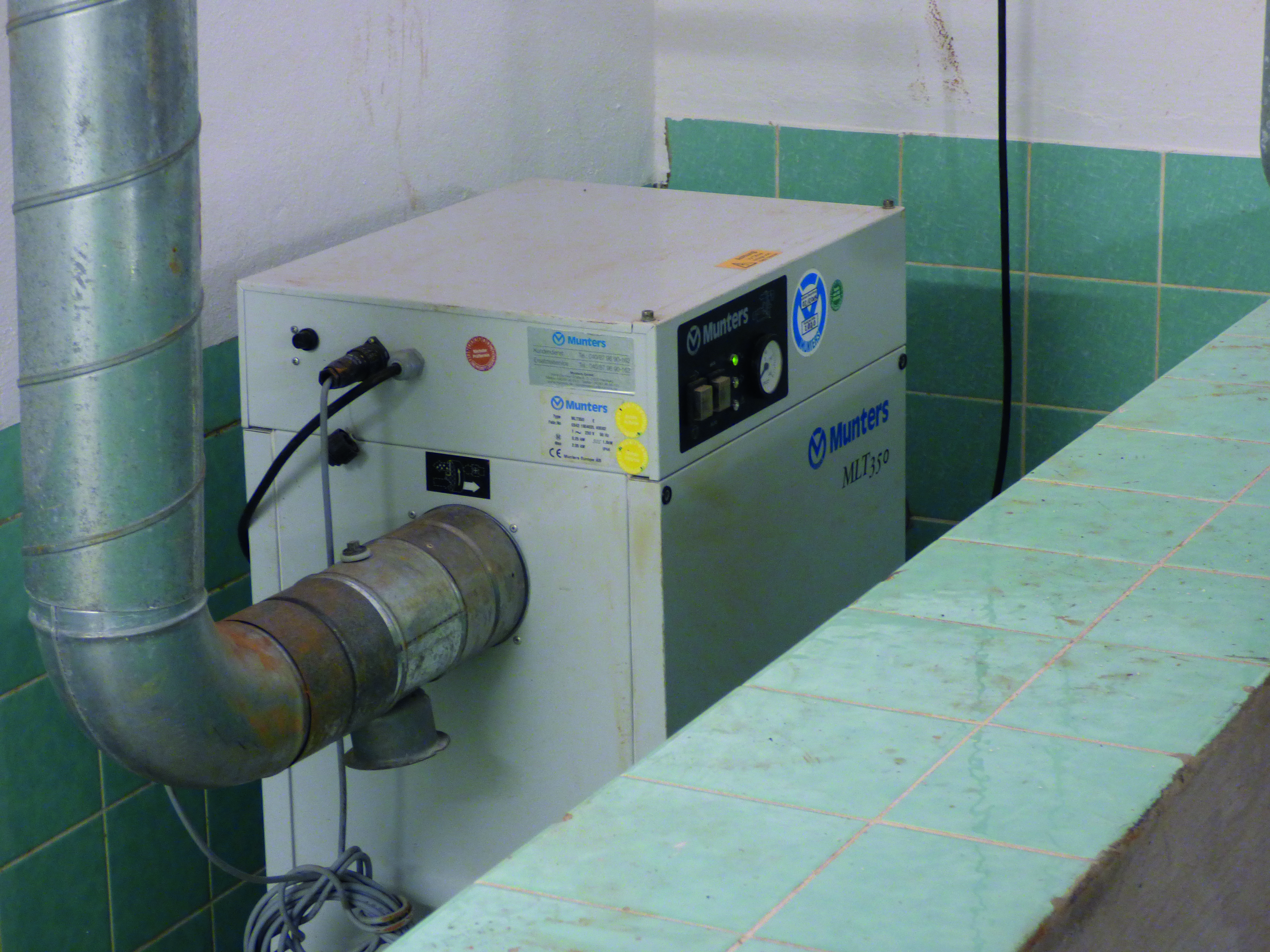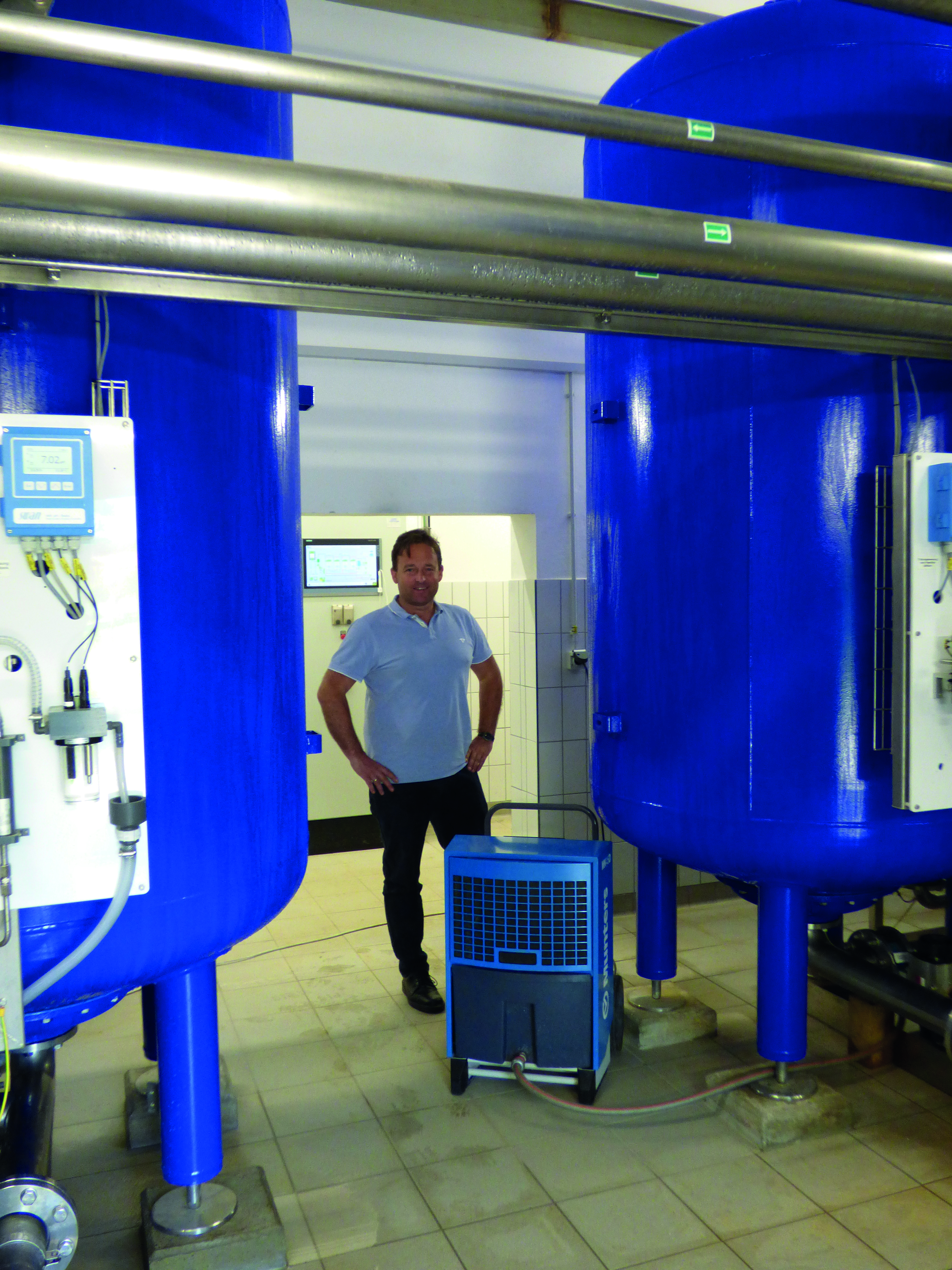 Adsorption dehumidification at the Alt-Georgsmarienhütte waterworks The Alt-Georgsmarienhütte water extraction area is a small area and comprises two wells in which the first coarse materials are already filtered out in the gravel filter area. By means of underwater pumps, the raw water is pumped to the Alt-Georgsmarienhütte waterworks and processed there. In a first process stage (oxidation), oxygen is brought into contact with the raw water in an atomising chamber in order to facilitate the precipitation of iron components in the raw water. In the second process stage, the precipitated iron is filtered out in an open basin using a range of various gravel packing procedures. Two demanganisation and deacidification tanks are located downstream. After this treatment, the water is in a lime/carbonic acid equilibrium. All raw water is treated naturally; no chlorine is needed for disinfection. After these cleaning stages, the pure water is temporarily stored in a storage tank (250 m³). The water is then pumped to the elevated tanks at Tannenkamp and Rehlberg by means of centrifugal pumps, and distributed from there to the Alt-Georgsmarienhütte network. Two different adsorption dehumidifiers from Munters (type M90L and MLT350) are used in the Alt-Georgsmarienhütte waterworks. In contrast to dehumidification by condensation (refrigerant dehumidification), sorption technology can achieve high dehumidification capacities even at low air and component temperatures, thus reaching the relative ambient air humidity required for condensation and corrosion prevention more reliably. The desiccant dehumidifiers from Munters have proven themselves, particularly in the case of open water areas that are always accompanied by low temperatures for drinking water treatment. The devices also have a log service life despite this less than ideal environment. Mobile refrigerant dehumidification at the Hagen waterwork The waterworks in the municipality of Hagen were taken over by WbV-Os-Süd at the beginning of 2019 and the systems were renovated as part of the takeover. Even in a modern new building, such as the waterworks in Hagen, humidity loads and therefore condensation on cold components such as filters, pipelines, etc. cannot be avoided from a structural perspective. To protect the new technology from corrosion and the electrical control system from failure, the water procurement association relies on the Munters MK Series refrigerant dehumidifiers.