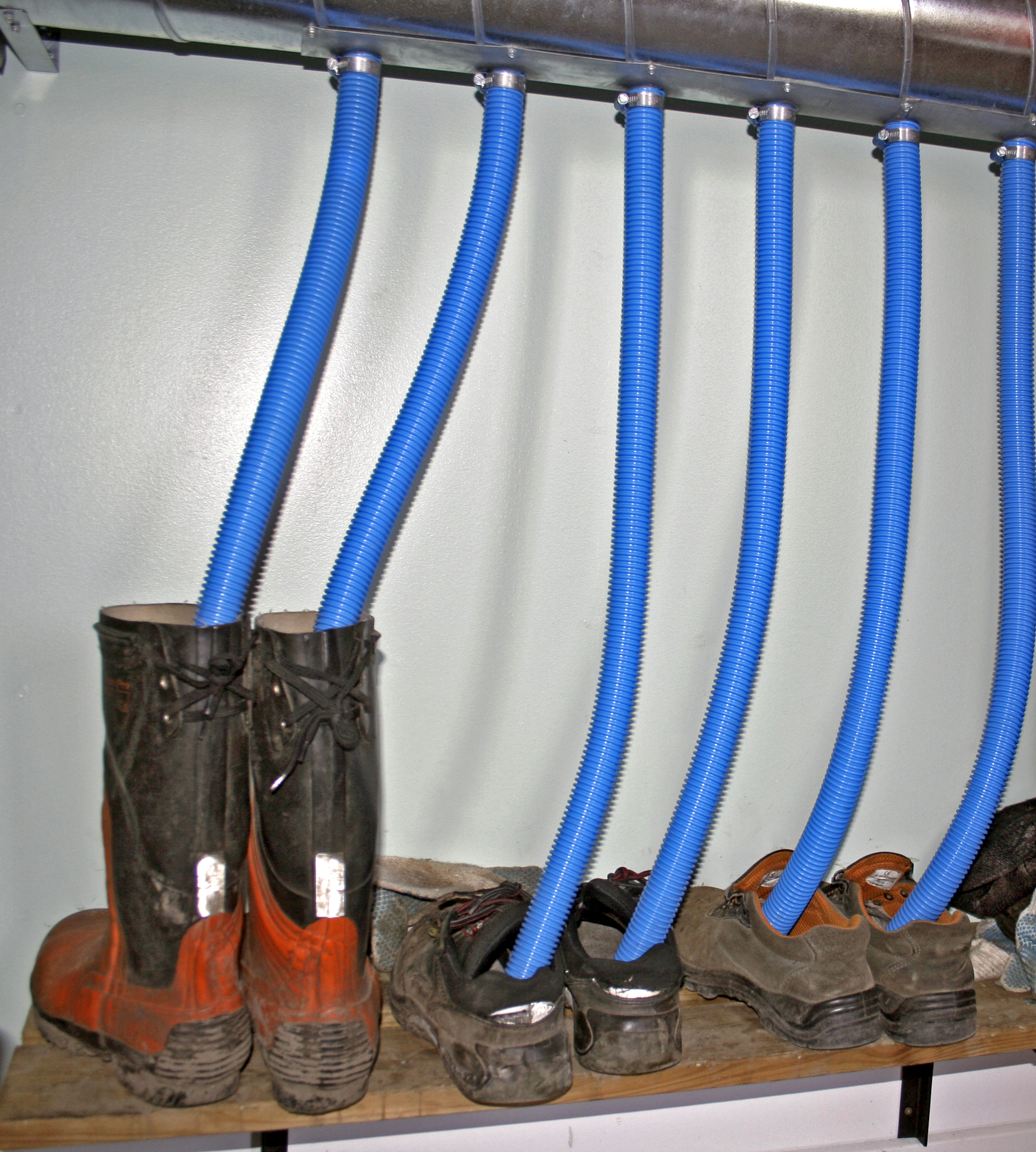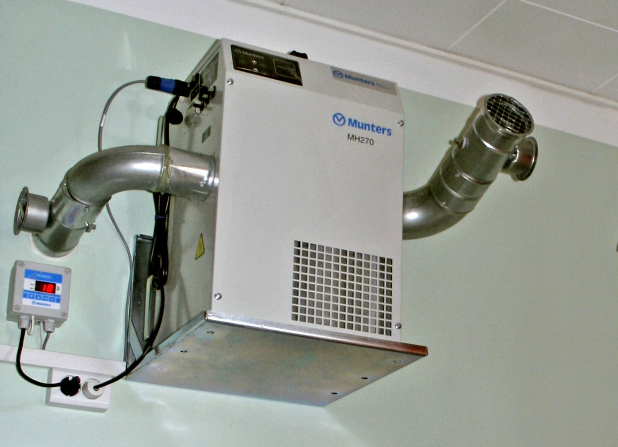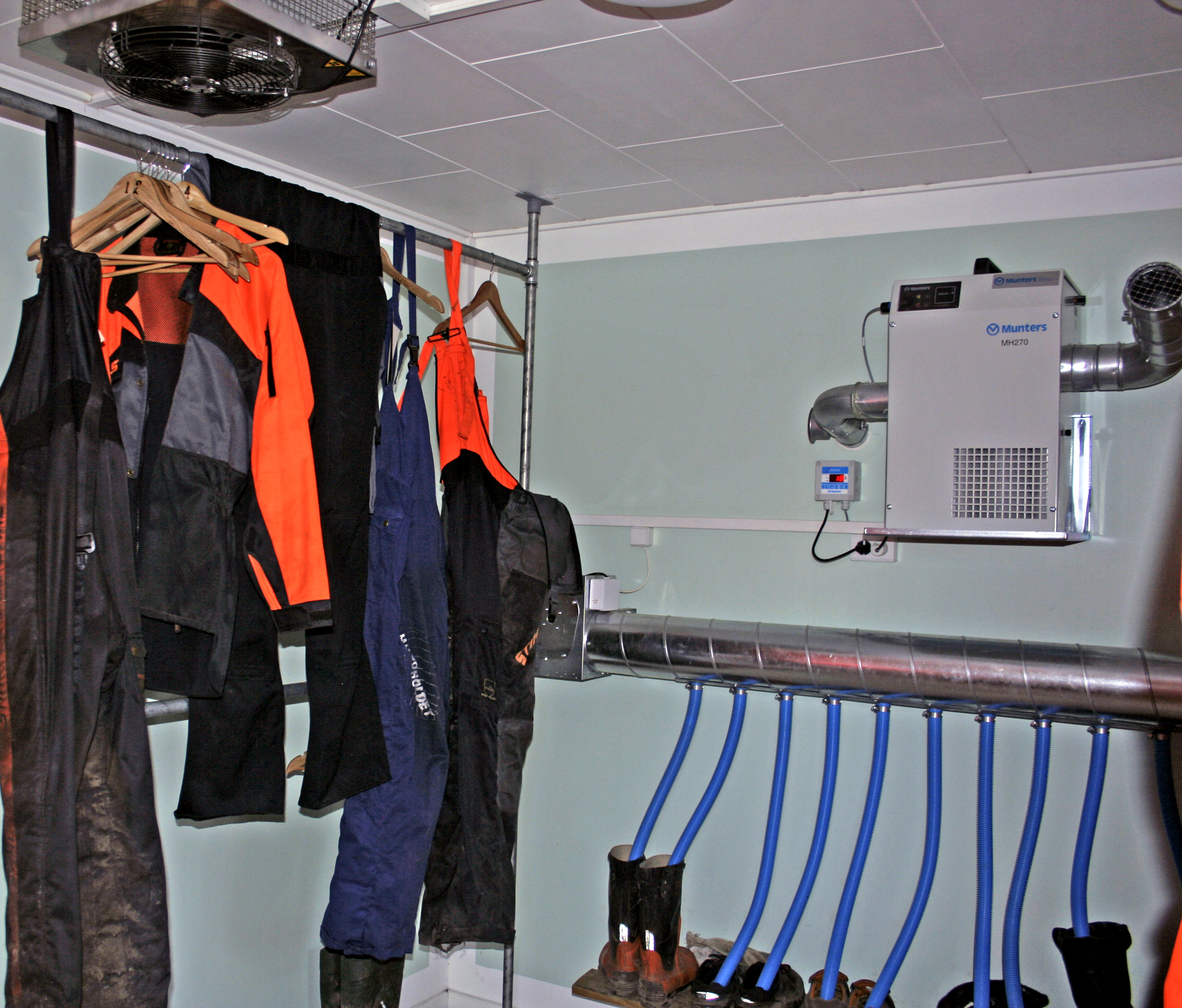 The Munters drying room mimics conditions outdoors during dry and breezy summers days, when laundry dries outdoors very quickly. A Munters MH270 desiccant dehumidifier and two circulation fans were installed in the drying room. Circulating fans mounted in the ceiling move air very quickly over the clothes and thus water from the clothes is released into the ambient air. The dehumidifier efficiently removes that water by absorbing it onto the desiccant rotor´s highly hygroscopic material, and then it is sent outdoors as warm and humid air. Furthermore, a rack system for effective shoe and boot drying was installed in the room. A duct fan ensures that the dry air from the room is sucked into the duct fitted with 20 outlets with short flexible hoses that are placed into the shoes and boots. Easy operation When the workday ends, employees now place their clothes on hangers in the drying room and their footwear is placed on a shelf. Using hangers and shoe racks is uncomplicated and fast compared to arranging the clothing in a narrow drying cabinet. Circulating fans are activated manually with a toggle switch. When the water from the clothes starts to be released into the air the dehumidifier will automatically start (humidistat controlled) and only operates until the clothes are dry. When staff return the next morning their clothes are thoroughly dry and comfortable to wear. Shoes and boots are also effectively dried and ready for use. Besides being a highly efficient drying method, the drying room is also gentle on clothes and boots compared to drying cabinets or tumble dryers since clothes are not exposed to high temperatures. To make the outfit more weather-resistant it is typically both lined and built with membranes. These membranes cannot withstand the high temperature in a drying cabinet or tumble dryer. Over time repeated and incomplete drying in the cabinets will cause bacterial growth, tenderization and unpleasant odors. Energy-saving solution An essential and important advantage of arranging a drying room to replace drying cabinets is the energy savings. Munters drying requires no heating since Munters desiccant dehumidification works efficiently even in cold conditions. The supply power of a Munters 10 m2 drying room (dehumidifier + fans) is only 1-2 kW. A room this size can replace eight drying cabinets with a total supply power of between 5-12 kW. The Danish Defense Construction Service (FBE) has conducted experiments proving that Munters drying concept has an efficiency of about 1 kWh per liter of water removed, where the traditional drying method with heating and ventilation utilizes 3-4 kWh per liter of water removed. Compared to electric drying cabinets, the energy saving is even greater. For many years the Munters drying room concept has been used with much success at military barracks. The solution is also used by Special Forces and the Diving Corps, with great appreciation, as well as for the efficient drying of rescue helicopter equipment. Today, many private companies benefit from the concept in employee changing rooms. Many day-cares and nurseries are replacing energy-intensive drying cabinet solutions with the Munters drying room concept. One example is Laerke School in Egedal that replaced eight drying cabinets with a drying room and achieved approximately 75% energy savings. Additionally, they benefit from now having a much more effective drying solution that kids can also operate themselves and that is suitable for all types of children’s clothes and boots.