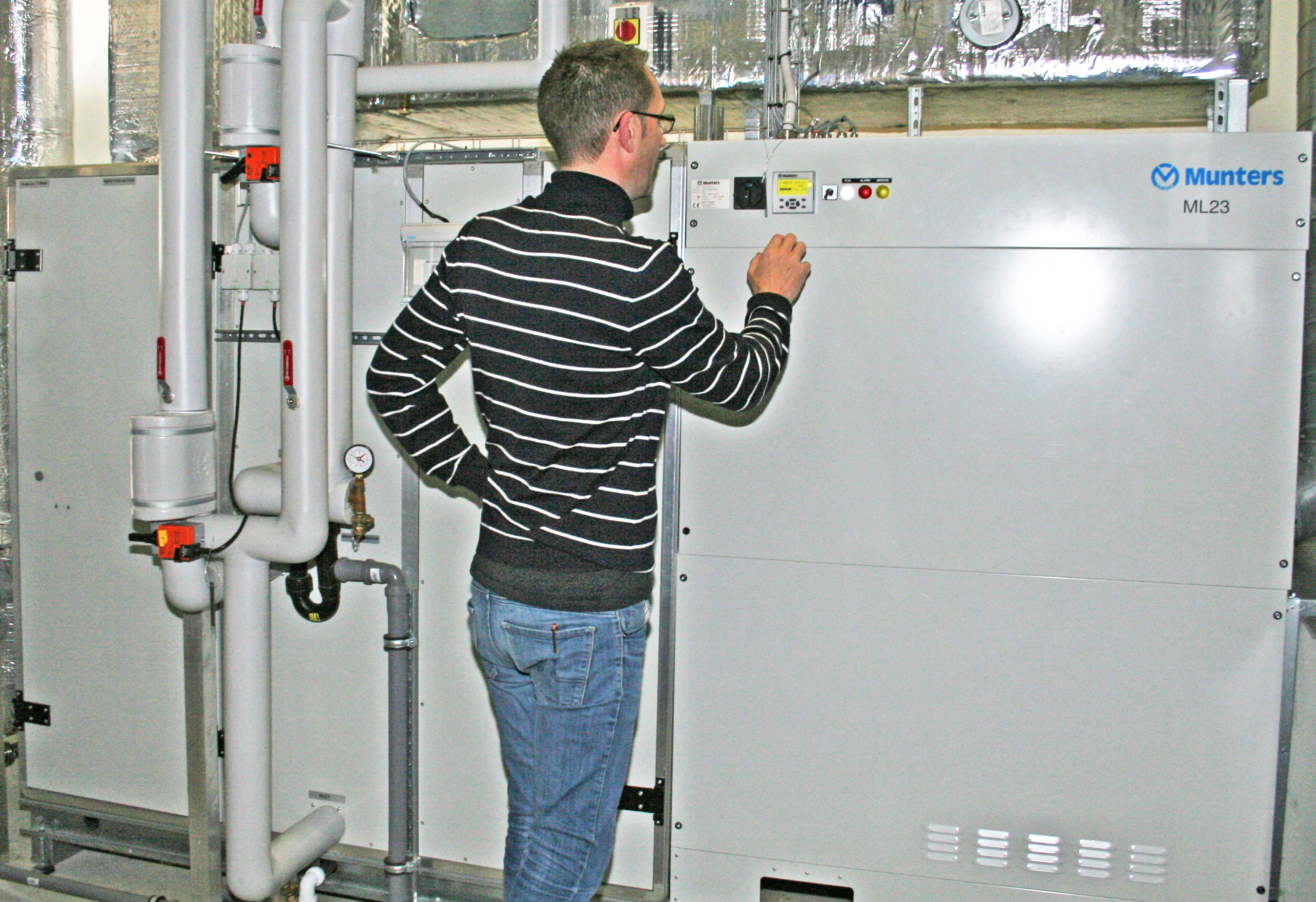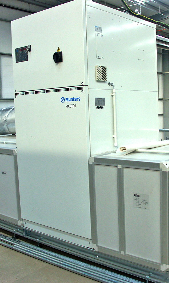 Since Xellia’s facilities are GMP compliant their Class-B clean rooms require strict temperature and humidity control. Munters was asked to design the optimal climate solution for these rooms. The selected MLPlus and MXPlus systems are designed to fit into environments with high demands on carbon footprint, energy efficiency and hygiene. Pre and post cooling standard modules can be added according to actual specifications and all fit on a common base frame with elegant design and cleaning-friendly surfaces. The units were designed to fit into the existing Xellia AC system, maintaining 20°C/ max. 20% RH conditions in the clean room. In the system´s pre-cooler module, process air is cooled and dehumidified to 13°C/9.4g/kg and led to the dehumidifier that reduces water content to less than 2.5g/kg. Temperature increase created by the dehumidification process is lowered by a post-cooler from 40°C to 20°C, with air led to the ducting system. HEPA filtration ensures that clean air is supplied to the clean rooms Air used for rotor reactivation is filtered by a EU5 filter. Wet, warm air from the dehumidification process is exhausted outdoors. Why Munters? By choosing a Munters Plus system, Xellia benefits since they have only one supplier for both dehumidification, pre and post-cooling/heating, filtration and humidification. The system is compact and flexible in the design and composition of needed modules. A satisfied customer Munters climate control solution for Xellia Pharmaceuticals not only met the strict demands for clean room classification but also solved a practical problem. Weighing process clean room production will not be interrupted or postponed anymore by bad weather conditions thanks to Munters dehumidification solutions. Clean room climate is now totally unaffected by outdoor variations in temperature and humidity and production can be precisely planned. Very happy with the Munters climate solution, Xellia Pharmaceuticals has appointed Munters supplier for their next clean room refurbishment.
