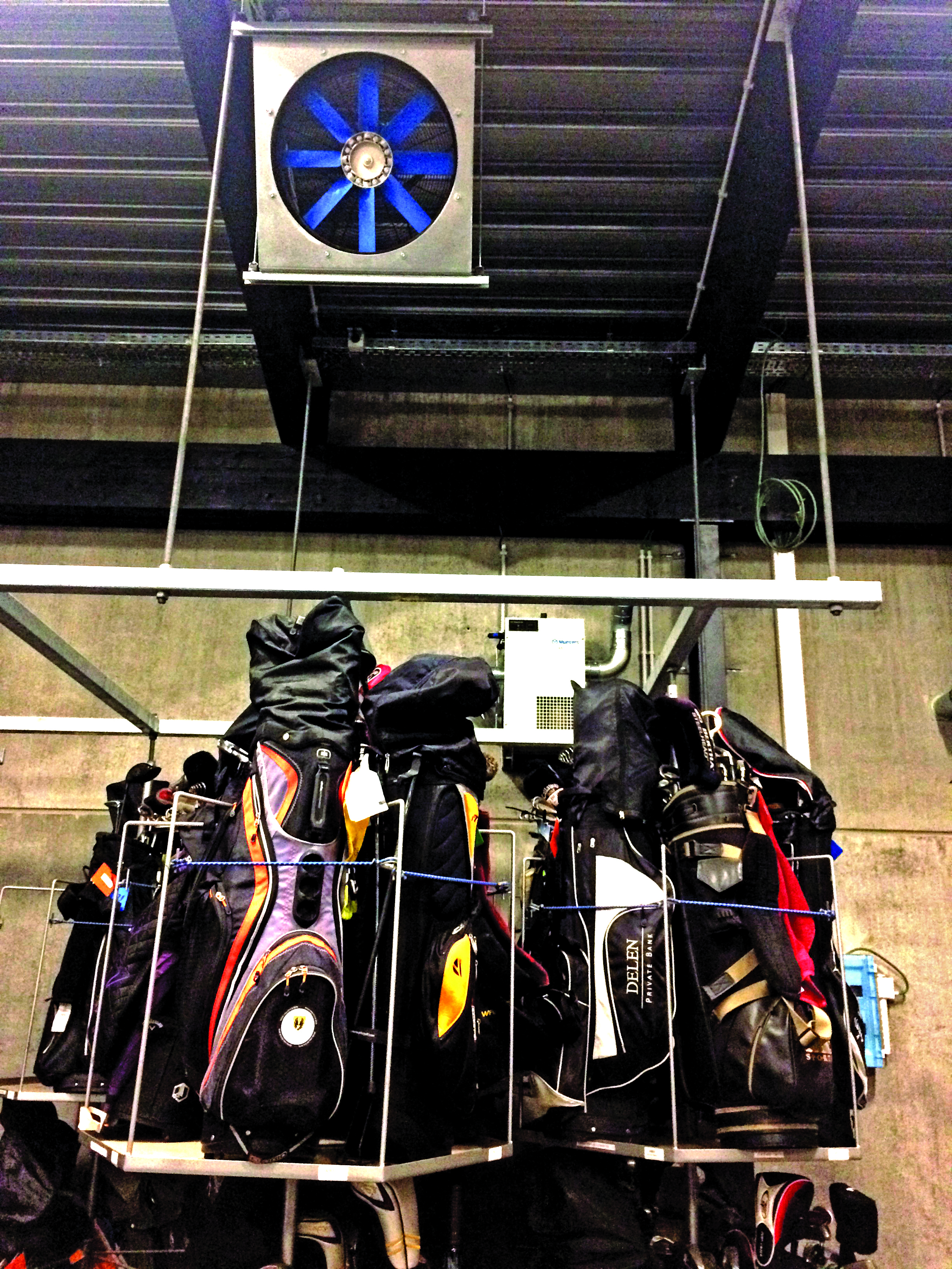 Once the centrally located new club house and caddy facilities next to the driving range were built, the club encountered a problem familiar to many golf clubs. “The caddy house has space for 750 golf bags, 250 trolleys with golf bags and 25 buggies. Golf is now an all-year-round sport,” says caddy master, Danny Matthyssens. “People play in the wind and rain. When the golf bags came back in after a rainy round, there was a risk of mold growing. Puddles also collected on the floor and the equipment remained damp for a long time. The members who pay fees to store their equipment, naturally complained to the caddy masters about this.” So Rinkven went looking for a solution. A simple approach was to provide natural ventilation which would just mean opening the windows occasionally combined with heating the storage areas, but this was inefficient. “After doing some simple calculations, it quickly became apparent that this would be a costly affair,” explains Matthyssens. “So we were very happy when Munters came up with their proposal.“