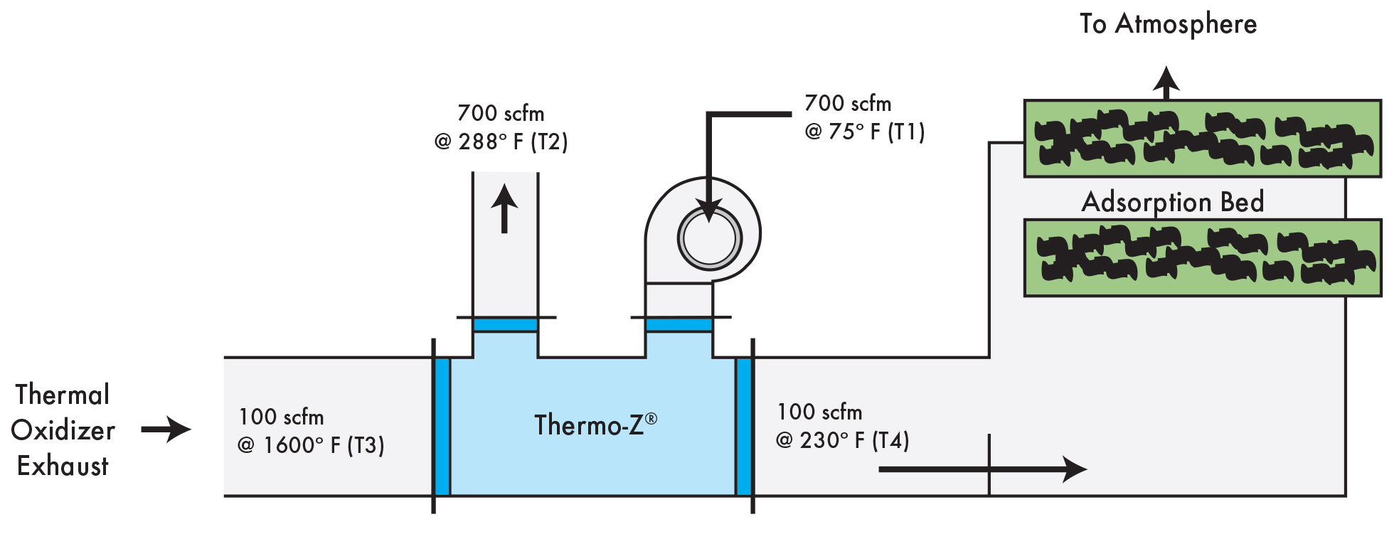 TerraTherm is an affiliate of Shell Technology Ventures, which develops commercial applications for concepts resulting from Shell Oil Company’s research. Shell developed a portable soil abatement system mounted on a trailer that is marketed by TerraTherm. Employing In-Situ Thermal Desorption (ISTD) technology, the system remediates a broad range of organic compounds such as PCBs, pesticides, petroleum wastes, and chlorinated solvents, all without excavating the soil. At the heart of the process lies a heat source consisting of thermal blankets placed on the ground for surface soil remediation and thermal wells bored for remediation zones extending up to several hundred feet deep. The Munters solution Heating elements in the blankets or wells heat the soil, causing the contaminants to vaporize. A vacuum system then draws the vapors from the ground. The heat in the soil destroys most of the contaminants, and the rest go to a vapor treatment system. A thermal oxidizer incinerates 90% of the volatile organic compounds (VOCs), with the remaining 10% passing through an activated carbon adsorption process. To work effectively, adsorption requires lower temperatures than the 1600ºF from the incinerator exhaust gas. A Munters Thermo-Z heat exchanger indirectly cools the exhaust to 230ºF using outdoor air. With tens of thousands of contaminated sites in the U.S., TerraTherm sees a significant potential for the ISTD system and has begun production to meet the demand. Eventually, the company envisions several dozen units operating around the country.