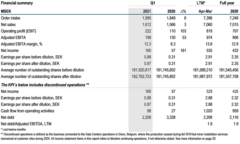 - Leverage (net debt/adjusted EBITDA, LTM*) was at 1.9x, the same level at per end of December 2020. The positive effect from improved cash flow from operating activities was offset an increase in net debt.