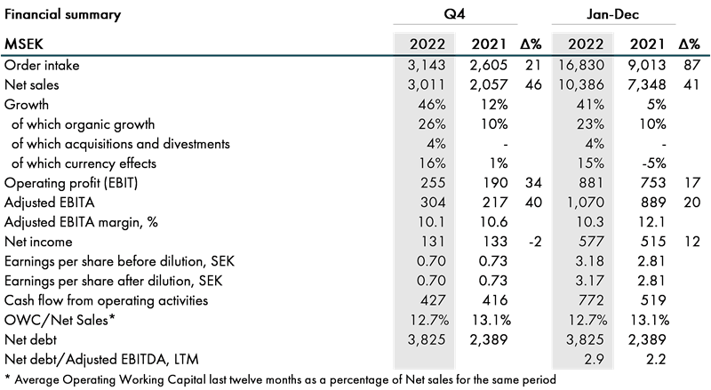 We have also taken major steps ahead in the areas of sustainability during the year. Internally we have made great efforts in mapping our emissions and worked with life cycle analysis of our products. With the life cycle analysis, we become even better at helping our customers reduce their emissions. Our contribution to a better climate is a strong driving force for us in our daily work. As I look back at 2022, I am very proud of the record order intake, strong net sales and the cash flow we have achieved. I look forward to continuing to strengthen our market position together with all employees in 2023.