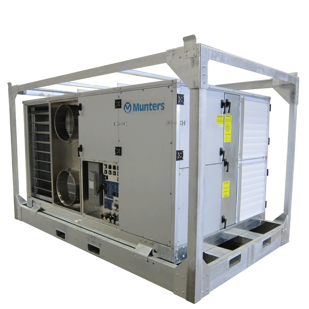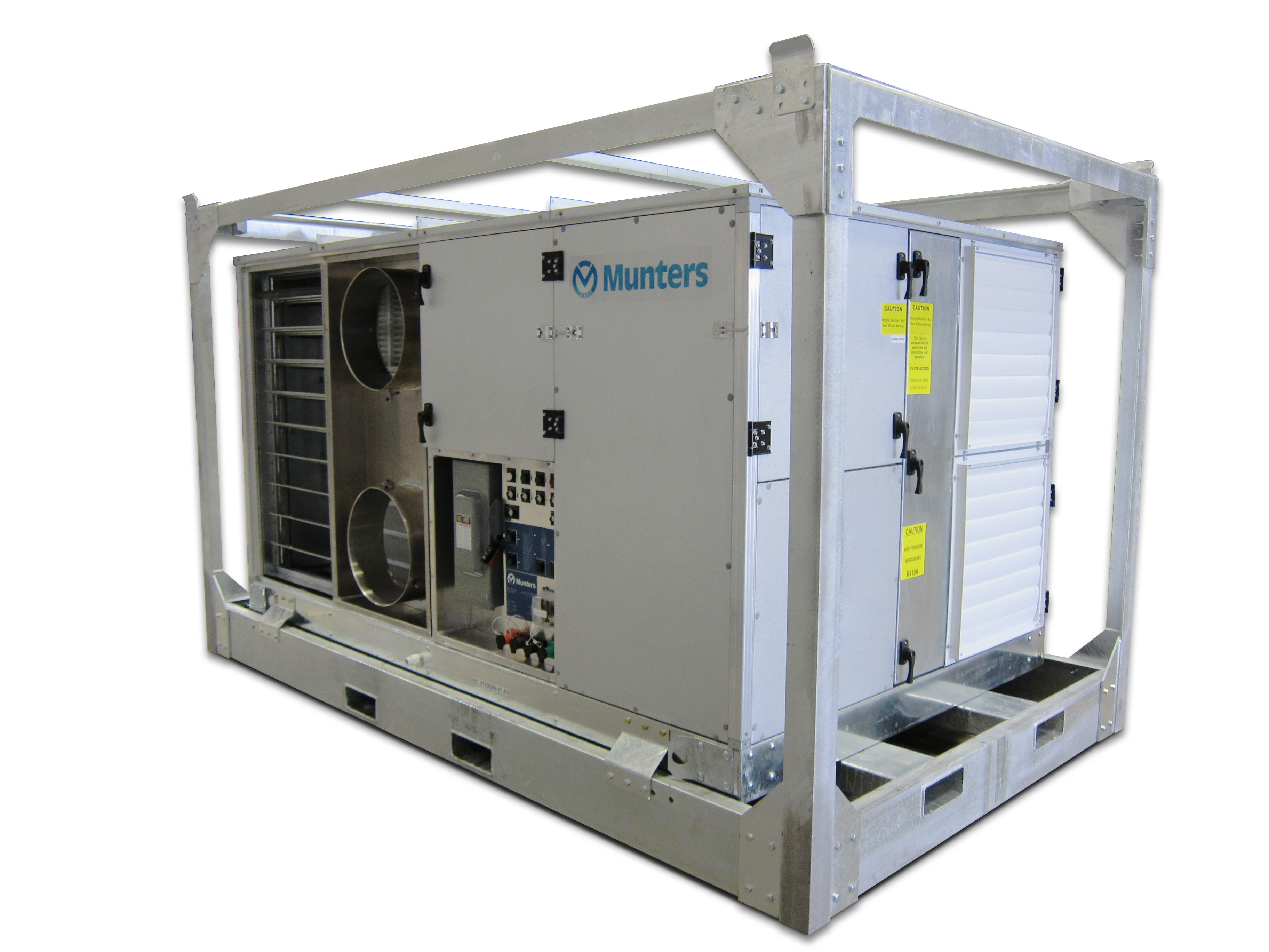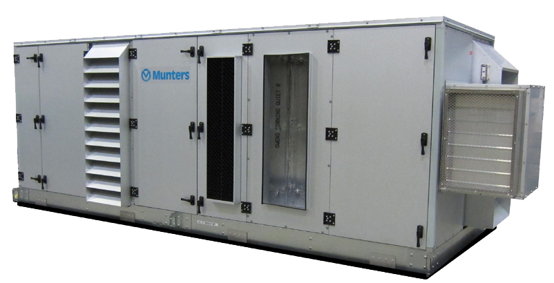 The Munters DryCool Standard, a dedicated outdoor air system (DOAS), conditions building supply air before it enters the HVAC system. It removes water vapor from ambient air or an air mixture while reducing energy use for cooling by up to 40% compared to other systems and uses less energy than other DOAS.