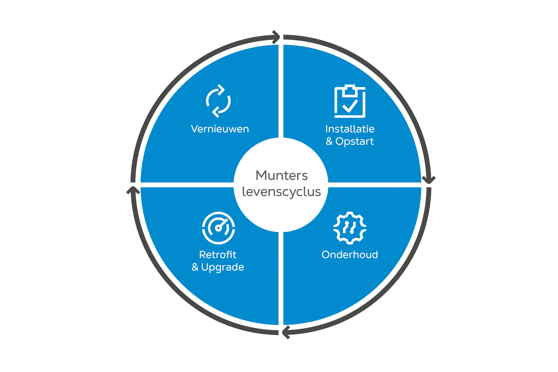 Tijdens de lange levensduur doorloopt je Munters-apparatuur vier fasen in de levenscyclus. Ongeacht de fase zorgen onze serviceproducten en -oplossingen voor een optimale werking en prestaties. Ons aanbod omvat alles, van installatie en grondig preventief onderhoud tot upgrades en hulp bij het ontwerpen van de beste vervangingsoplossingen als je apparatuur vernieuwd moet worden. Dat laatste duurt trouwens nog heel lang...
