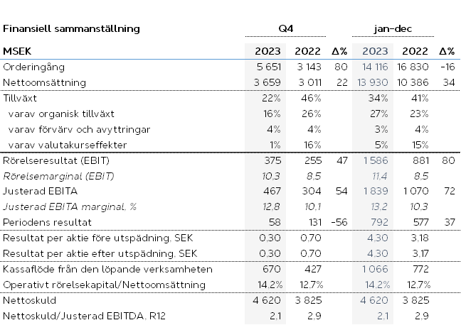 Nettoskulden i relation till justerad EBITDA per 31 december 2023 var 2,1x jämfört med 2,2x per sista september 2023 och 2,9x per sista december 2022. Nettoskulden uppgick den 31 december 2023 till MSEK 4 620 jämfört med MSEK 4 399 per sista september 2023. Per sista december 2022 uppgick nettoskulden till MSEK 3 825.