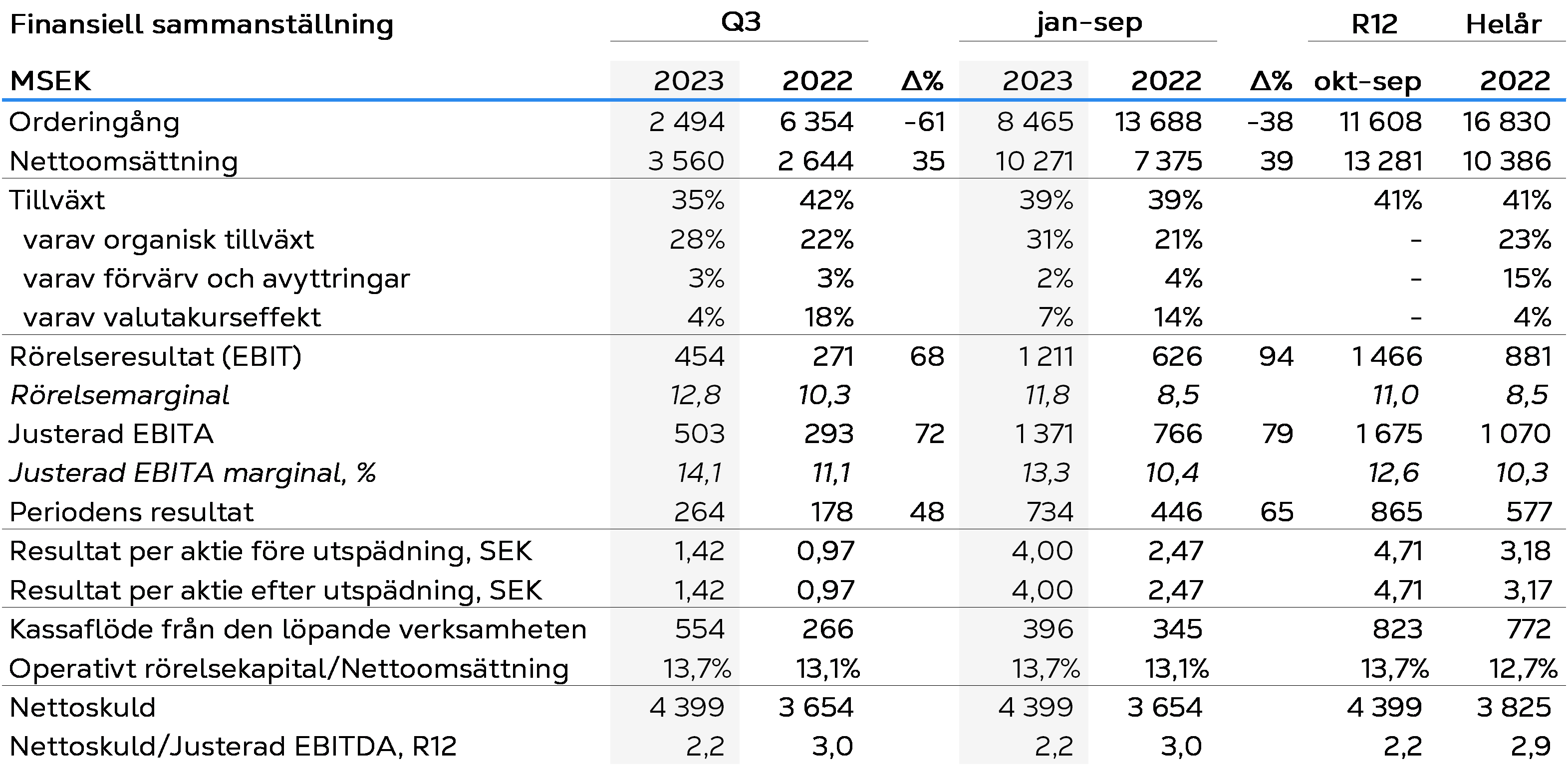 - Den starka förbättringen av just. EBITA-marginalen var främst relaterad till ökad nettoomsättning inom DCT och AirTech, samt effektivitetsförbättringar inom alla affärsområden. Den betydande marginalförbättringen inom DCT drevs främst av ökad produktion i USA.